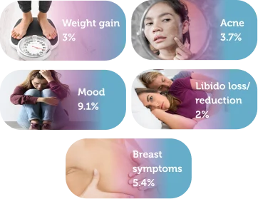 The most common adverse reactions (≥2%) in the studies were bleeding irregularities, mood disturbance, headache, breast symptoms, dysmenorrhea, acne, increased weight, and decreased libido.